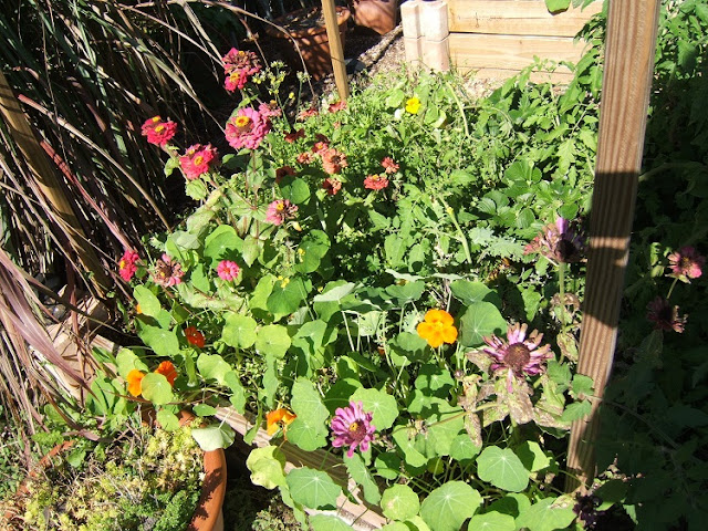 I threw hundreds of seeds into this circular garden when I prepared the beds. Some were single flowers and others were mixes. There are alot of weeds in there that I have not taken out yet as I did not know what some of those flowers would look like growing so I left them. Most are turning out to be flowers actually. But in there are primrose, larkspur, queen anne's lace, red poppies, and other things that are still in their growing stage. It looks mostly weedy, not the kind of flower patch I wanted, but this is the first year for this circular garden and I wanted to see what grows and how.