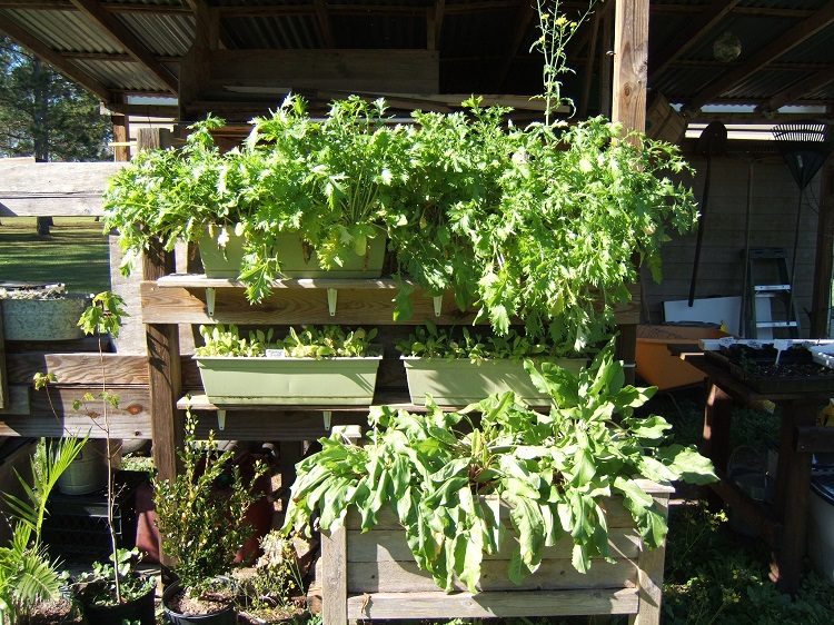 The three main veggie beds each 4' x 8'. They should grow some tomatoes, which we did finally get a lot of but not until December and January(!?)....dozens of full size tomatoes, then the frost came and killed the ones I could not pick as they were too green. We also have eggplant, collards, red lettuce, thai basil, lavender, and strawberries which are all coming up and back this year, but most of the strawberries were misshapen and not sweet at all. I ate them anyway. The middle bed is a mix of flowers, always a mystery. So far Chinese Forget Me Nots are taking over....though I have over 15 different species in here. We'll see what summer brings.